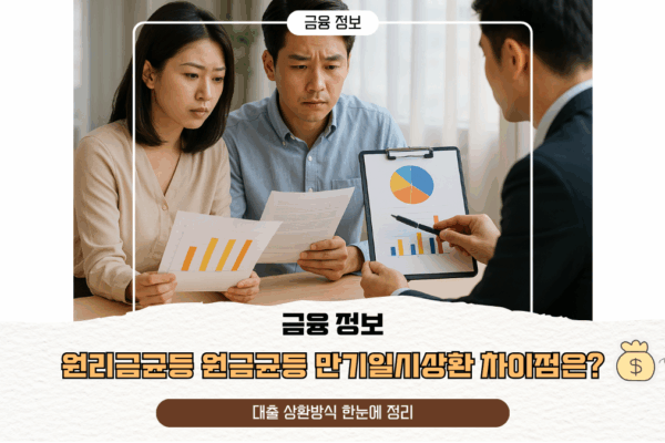 🏦 원리금균등·원금균등·만기일시상환 차이점은? 대출 상환방식 한눈에 정리! 📢 “같은 금액을 빌려도 상환방식에 따라 부담이 다르다?”대출을 앞둔 분들이 반드시 알아야 할 핵심 포인트 중 하나는 바로 **”상환방식”**입니다. 이처럼 대출 상품을 선택할 때, 상환방식은 총 상환금액과 월 부담금에 직접적인 영향을 미칩니다. 오늘은 금융 전문가의 시각으로 원리금균등, 원금균등, 만기일시상환의 개념과 차이, 그리고 2025년 기준 유리한 선택 팁까지 완벽…