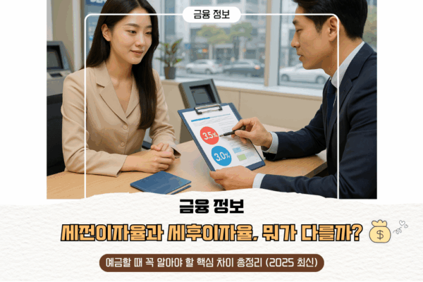 💰 세전이자율과 세후이자율, 뭐가 다를까? 예금할 때 꼭 알아야 할 핵심 차이 총정리 (2025 최신) 1. 세전이자율과 세후이자율, 진짜 뭐가 다른가요? 🤔 “예금 이율 연 3%!”은행 광고, 포스터, 어플…너무나 쉽게 마주치는 이자율,그런데 여러분, ‘세전’과 ‘세후’이 차이, 정말 정확히 알고 계신가요? 많은 분들이‘예금이자 = 광고에 나온 이자’로 착각하지만,실제로 내 통장에 들어오는 돈은광고에서 본 금액보다 훨씬 적을…
