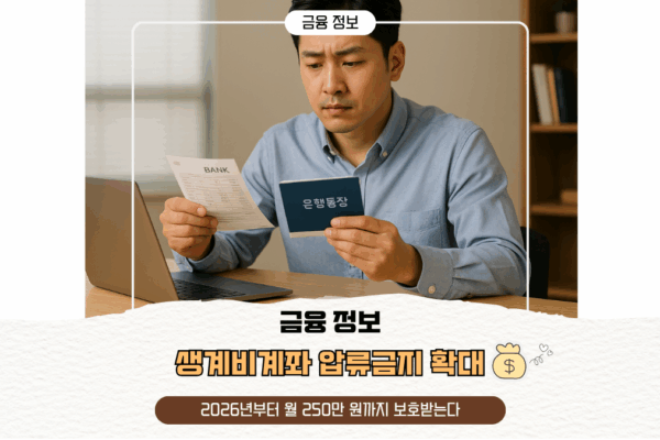 생계비계좌 압류금지 확대, 2026년부터 월 250만 원까지 보호받는다 2026년 2월부터 시행되는 새로운 압류금지제도 개정안에 따라 생계비계좌의 보호 한도가 기존보다 크게 상향된다. 금융기관에 개설한 생계비계좌에 한해 월 최대 250만 원까지 예금이 압류되지 않도록 보호된다. 이는 기존 185만 원에서 65만 원이 추가된 것으로, 채무자가 안정적으로 생활비를 사용할 수 있도록 하기 위한 목적이다. 동시에 보장성 보험금에 대한 압류금지…