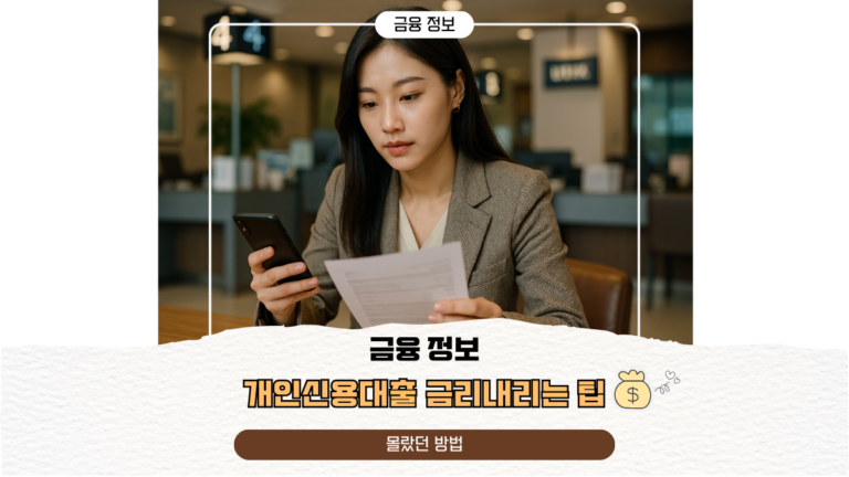 개인신용대출 금리내리는 팁, 몰랐던 방법 2025년 현재, 국내 가계대출 잔액은 약 1,100조 원을 넘어서며 개인의 신용대출 이용률도 계속 증가하고 있다. 특히 물가 상승과 금리 인상 기조 속에서 많은 사람이 대출금리에 민감하게 반응하고 있으며, 같은 조건이라도 금리 차이로 인해 상환 부담이 크게 달라진다. 👉 알아두면 좋은 금융 이야기 👉 알아두면 좋은 금융관련 주요용어 하지만 신용대출을 받을…
