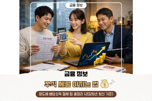 주식 세금 아끼는 법|양도세·배당소득 절세 팁 총정리 (2026년 최신 기준) 1️⃣ 주식 투자, 세금 구조부터 이해하기 주식 투자에서 발생하는 세금은 크게 세 가지 단계로 나눌 수 있습니다. 구분 세금 종류 설명 취득 단계 취득세 없음 주식은 부동산과 달리 취득세가 부과되지 않습니다. 보유 단계 배당소득세 기업이 배당을 지급할 때, 개인은 배당소득세를 부담합니다. 처분(매도) 단계 양도소득세 주식을…